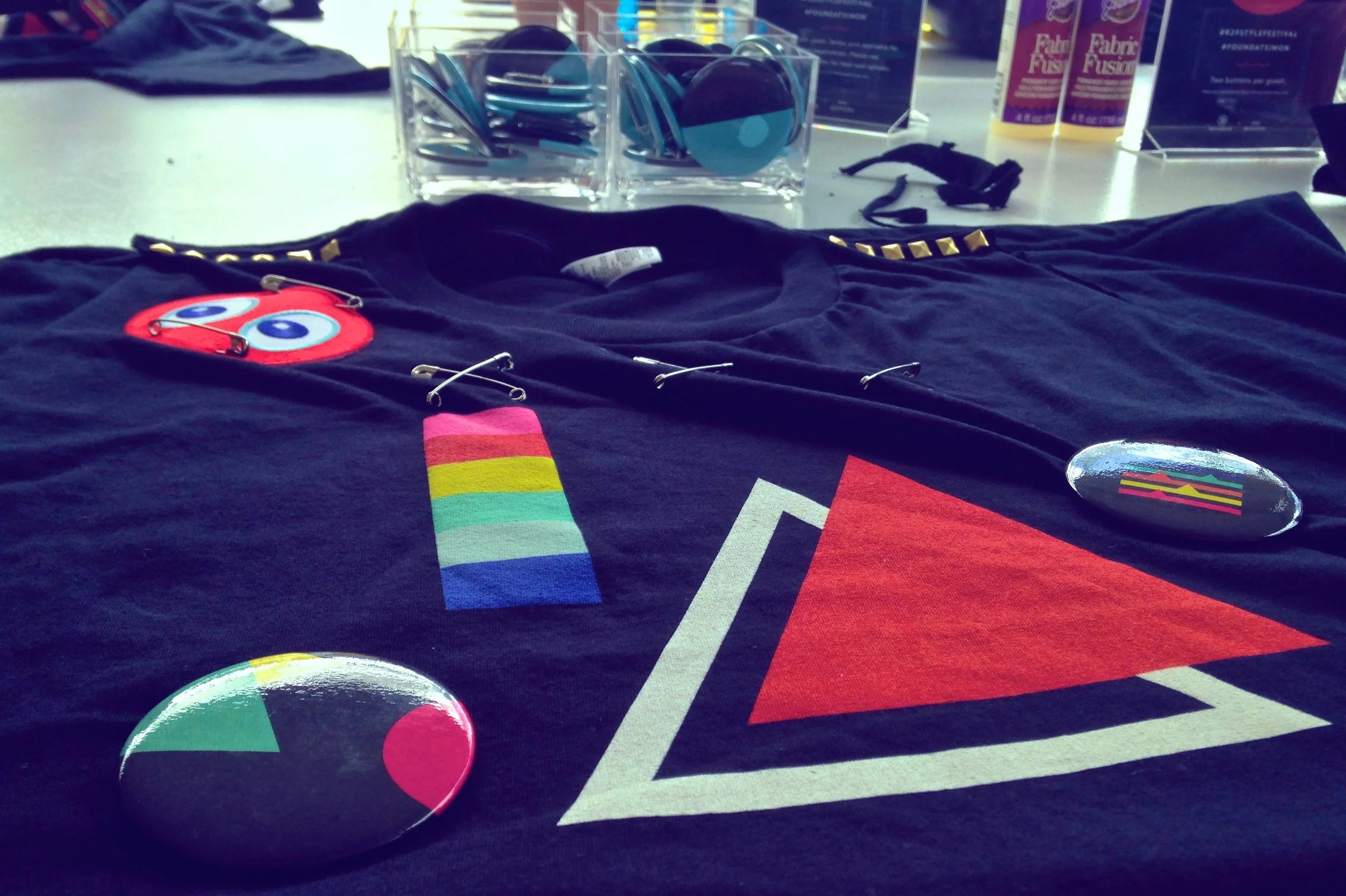 I’m a big fan of DIY projects, so the t-shirt station beckoned me to sit down and chill out with studs, safety pins, patches, buttons and scissors. I grabbed a tee and noticed the American Apparel label. (And I giddily snipped away, gasped and thought, “Yeah, I just cut up an AA shirt.”) The jersey knit tee is perfect for DIY customizations like this fabulous opportunity.