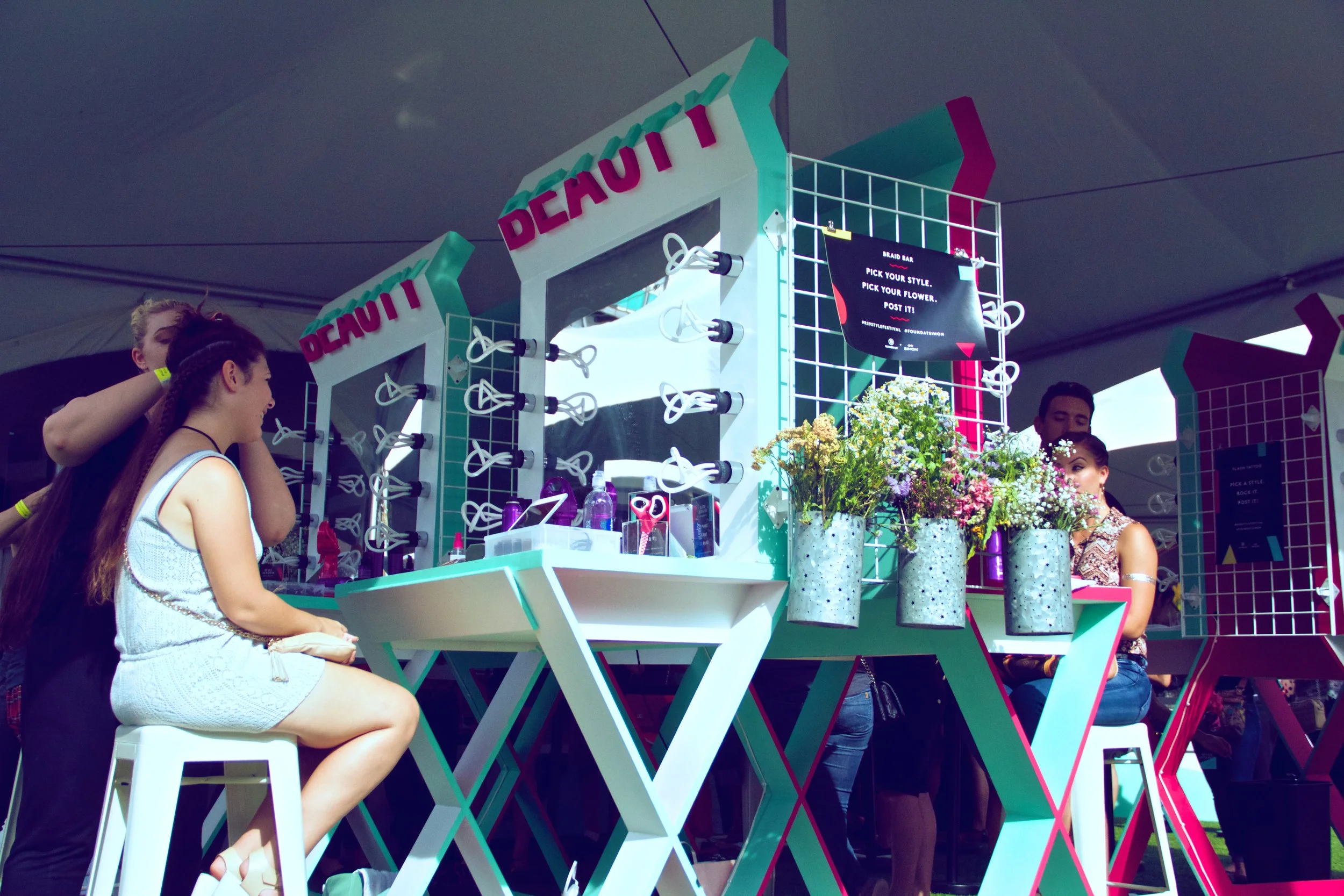 The beauty station had the lines out the tent, with ladies waiting for flowers and braids in their hair— but not without completing their festival style with adorning themselves in the complimentary gold and silver